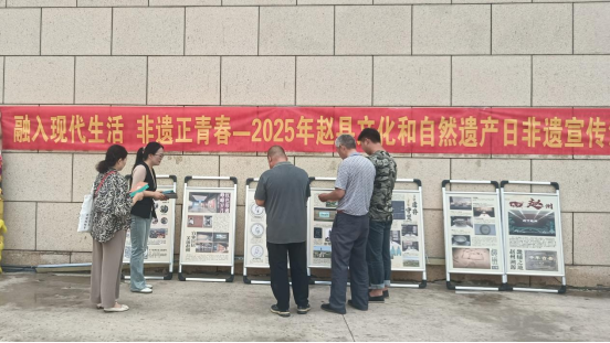 活动当日,赵州桥古镇,热闹非凡,悬挂“融入现代生活非遗正青春——2025年赵县文化和自然遗产日非遗宣传活动”条幅,摆放赵县博物馆移动的图版介绍,引得过往行人纷纷驻足观看。