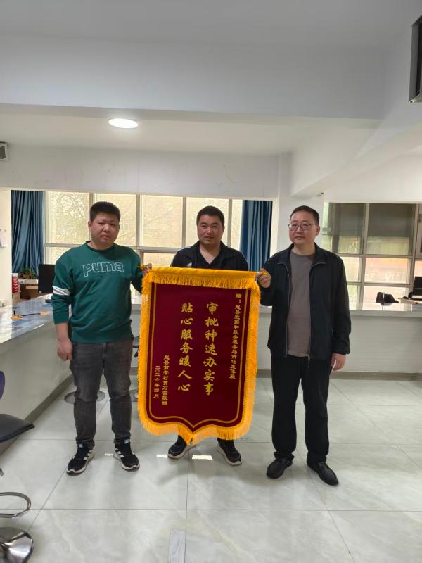 近日,赵县数据和政务服务局市场主体股收到了一份来自赵县前营村村民贾先生赠送的珍贵礼物——一面书写着“审批神速办实事,贴心服务暖人心”的鲜红锦旗。这面锦旗既承载着贾先生的诚挚谢意,更凝聚着对我局工作人员专业素养、责任担当与服务精神的高度认可。