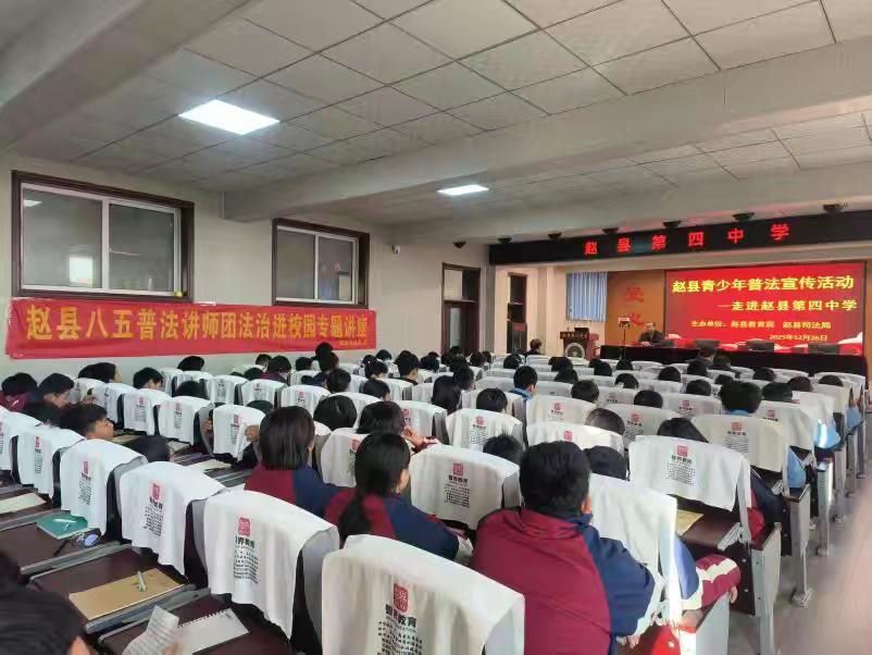 为进一步加强未成年人法治教育,有效预防校园欺凌,切实守护青少年健康成长,2025年12月26日,赵县司法局联合赵县教育局邀请县“八五”普法讲师团成员、河北冀联律师事务所律师焦秋果,走进赵县第四中学开展预防未成年人校园欺凌专题法治讲座,为全校学生送上一堂生动实用的法治课。