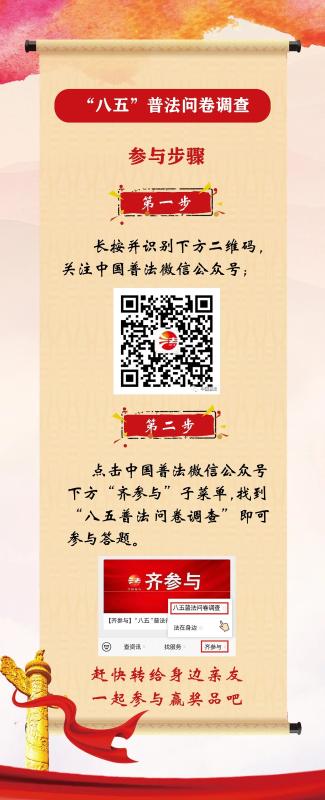 关注中国普法微信公众号,点击手机下方“齐参与”菜单,找到“八五普法问卷调查”,进入问卷调查页面即可。