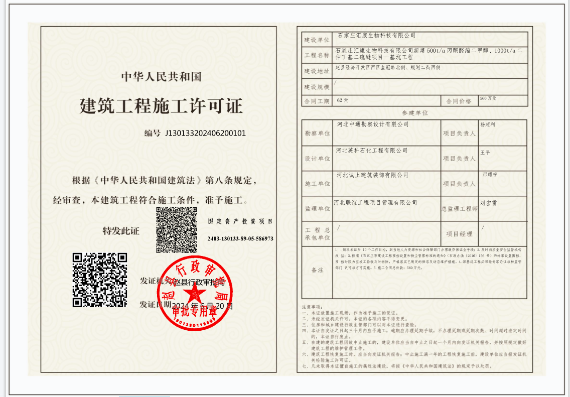 石家庄汇康生物科技有限公司建筑工程施工许可证