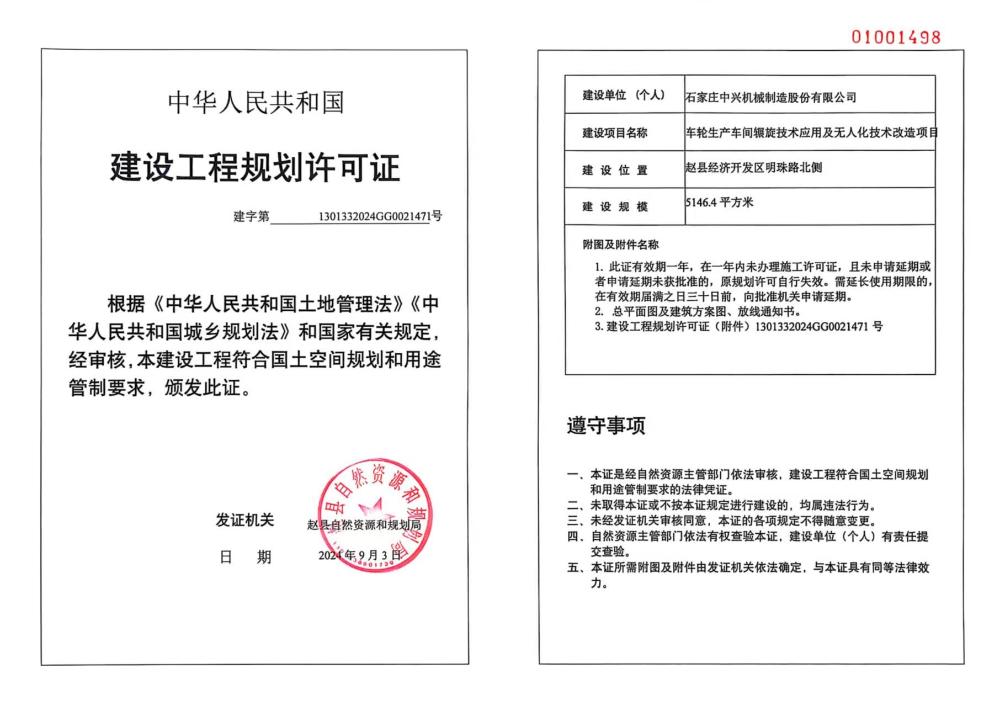 石家庄中兴机械制造股份有限公司车轮生产车间辗旋技术应用及无人化技术改造项目建设工程规划批后公告