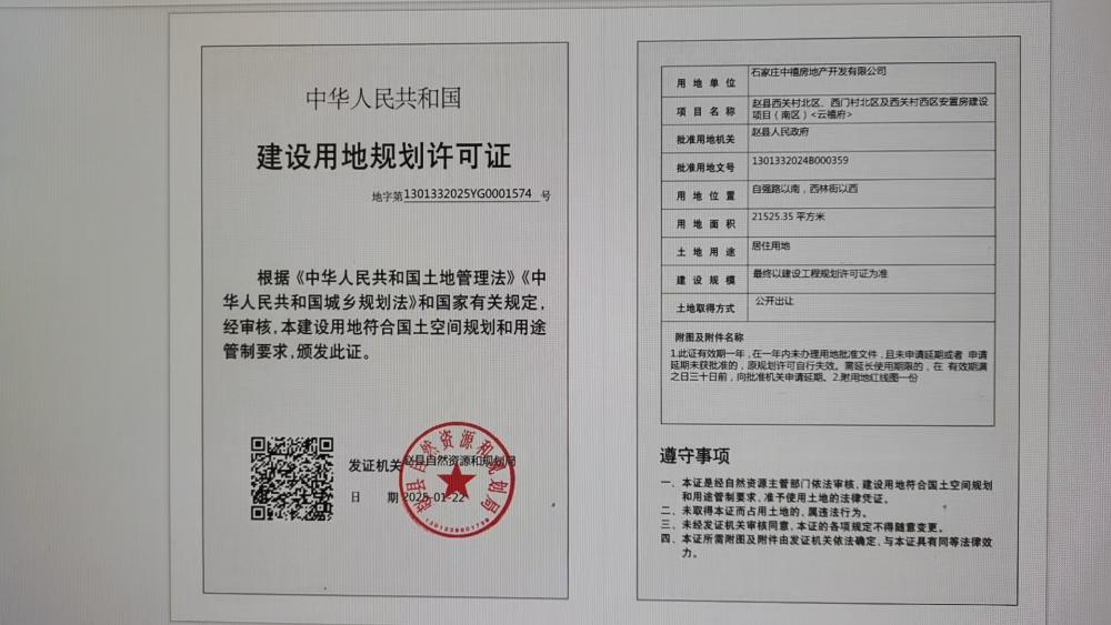 石家庄中禧房地产开发有限公司赵县西关村北区、西门村北区及西关村西区安置房建设项目(南区)<云禧府>建设用地规划批后公告