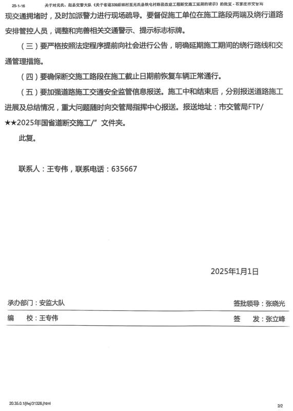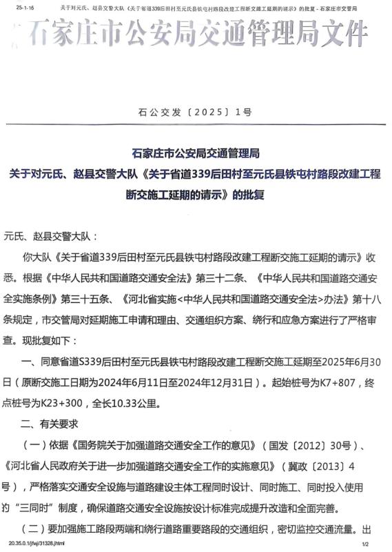 关于省道339后田村至元氏县铁屯村路段改建工程断交施工延期请示的批复