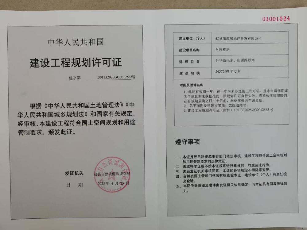 赵县蒲源房地产开发有限公司学府雅居项目建设工程规划批后公告