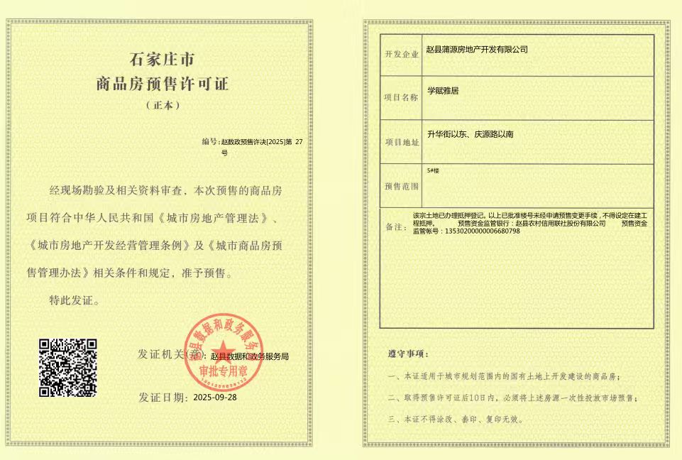 赵县蒲源房地产开发有限公司学赋雅居5#楼商品房预售许可证