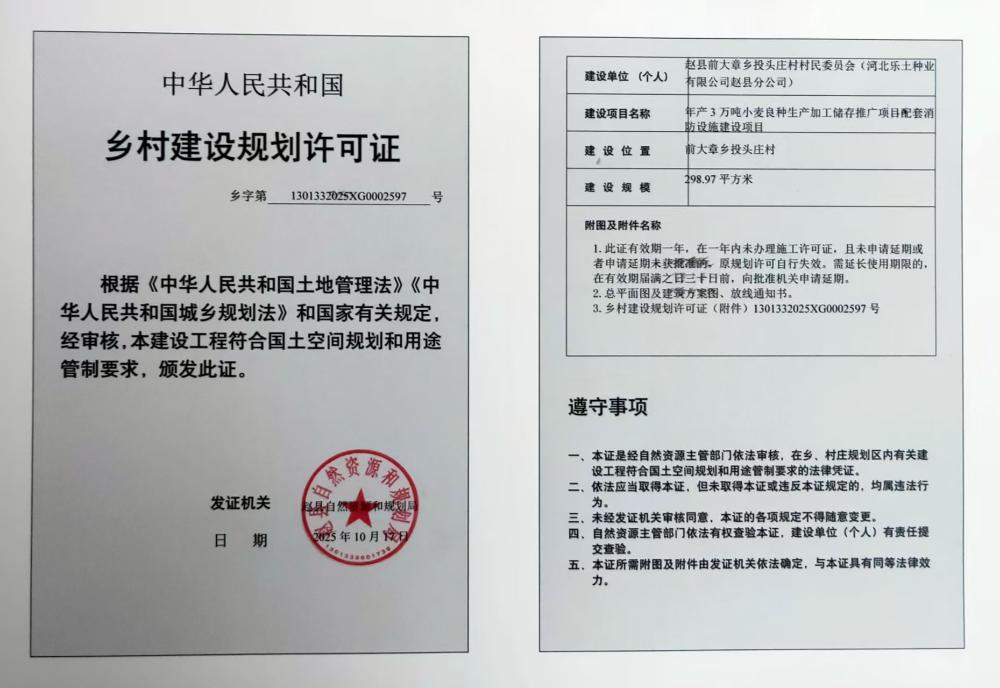 赵县前大章乡投头庄村村民委员会(河北乐土种业有限公司赵县分公司)年产3万吨小麦良种生产加工储存推广项目配套消防设施乡村建设规划许可证