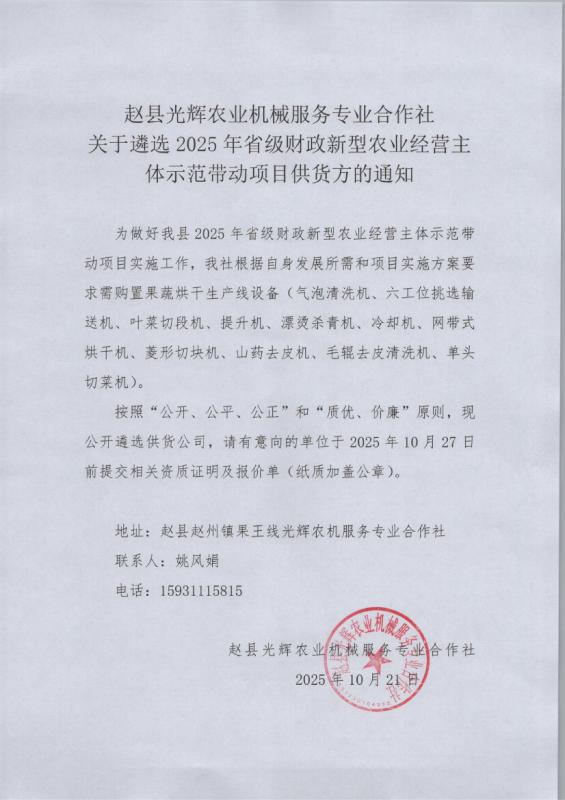 关于遴选2025年省级财政新型农业经营主体示范带动项目供货方的通知