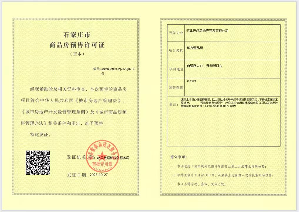 河北元点房地产开发有限公司东方壹品苑1#住宅楼商品房预售许可证