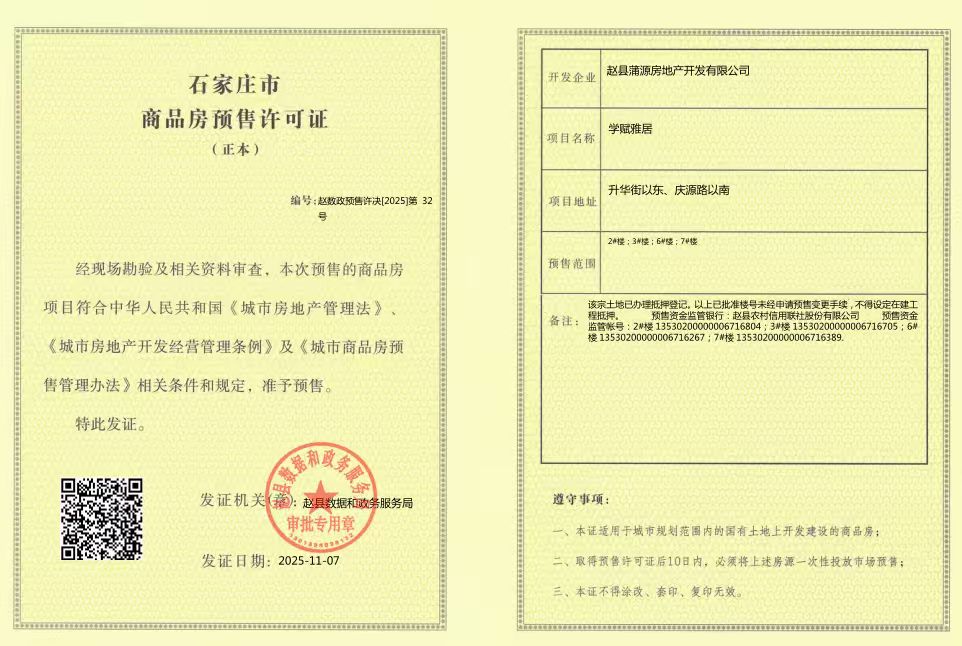 赵县蒲源房地产开发有限公司学赋雅居2#、3#、6#7#商品房预售许可证