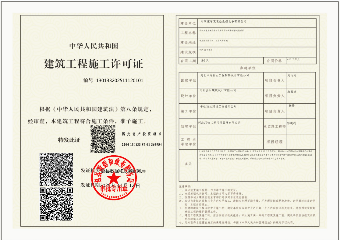 石家庄摩克速绘数控设备有限公司建筑工程施工许可证