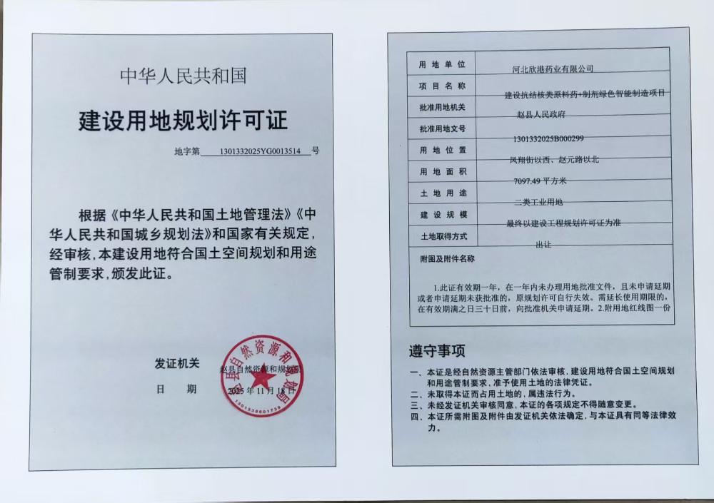 河北欣港药业有限公司建设抗结核类原料药+制剂绿色智能制造项目建设用地规划批后公告