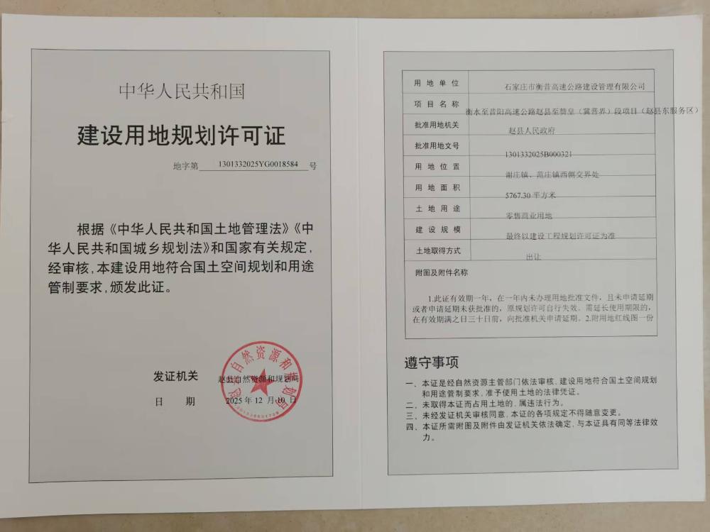 衡水至昔阳高速公路赵县至赞皇(冀晋界)段项目(赵县东服务区)建设用地规划批后公告