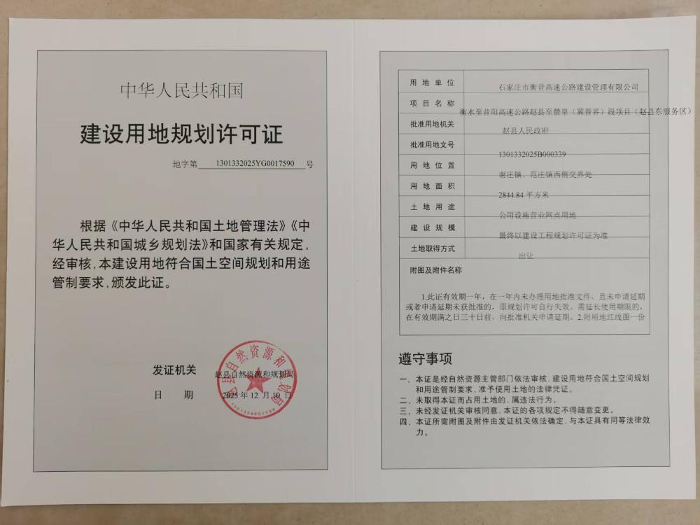 衡水至昔阳高速公路赵县至赞皇(冀晋界)段项目(赵县东服务区)建设用地规划批后公告