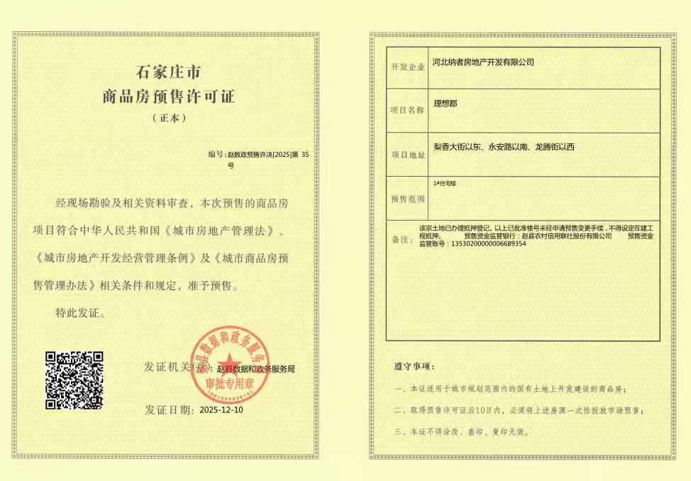 河北纳者房地产开发有限公司理想郡1#住宅楼商品房预售证