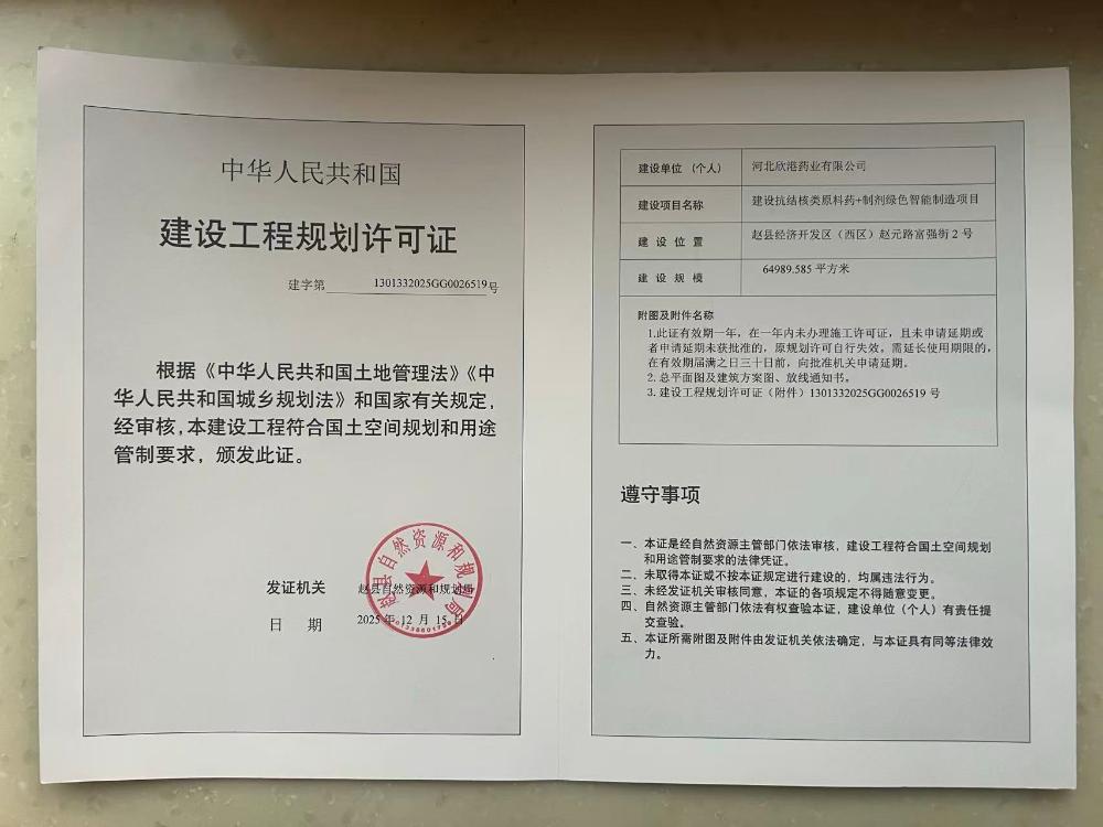 河北欣港药业有限公司建设抗结核类原料药+制剂绿色智能制造项目建设工程规划许可证