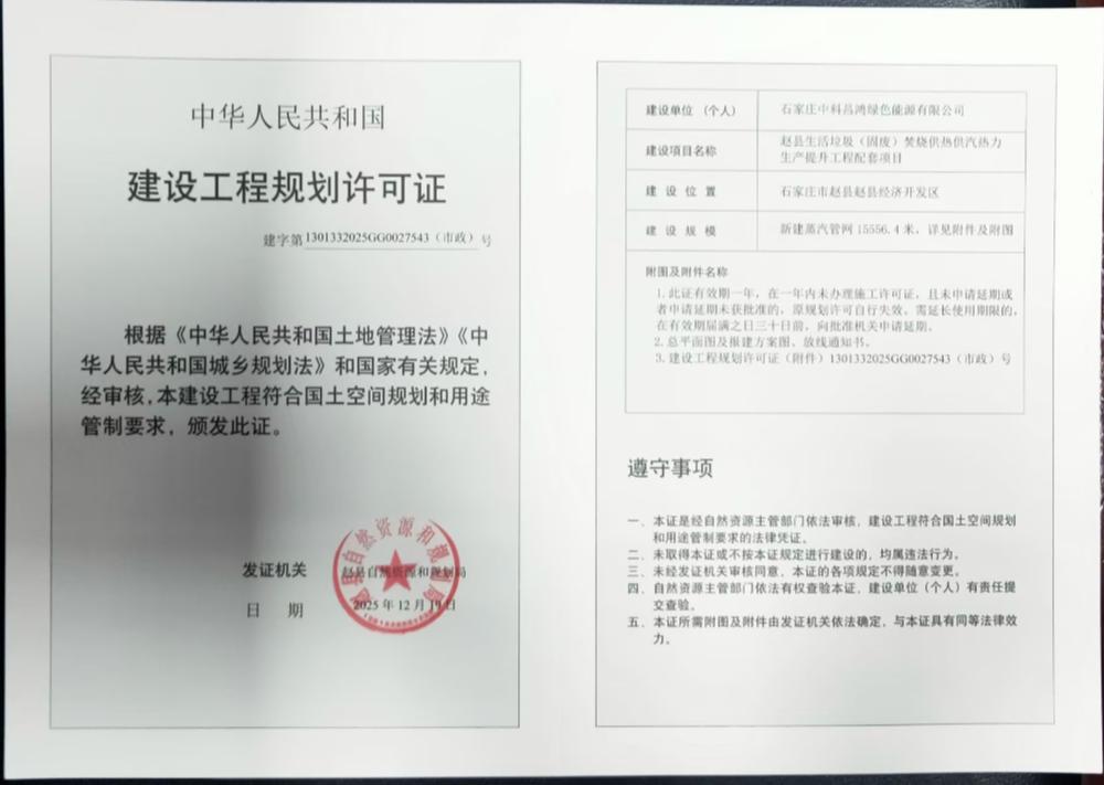 石家庄中科昌鸿绿色能源有限公司赵县生活垃圾(固废)焚烧供热供汽热力生产提升工程配套项目建设工程规划批后公告
