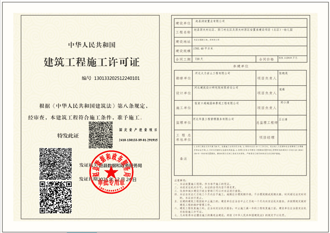 赵县润安置业有限公司赵县西关村北区、西门村北区及西关村西区安置房建设项目(北区)-幼儿园建筑工程施工许可证