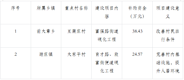本次纳入赵县2026年革命老区重点村建设项目的村庄共2个,涉及前大章乡豆腐庄村、谢庄镇大东平村,项目总投资63万元,全部为革命老区转移支付专项资金,无县级财政配套资金,资金使用严格遵循“突出重点、公开透明、注重实效、强化监督”原则,主要用于革命老区重点村提升村容村貌建设。具体项目详情如下: