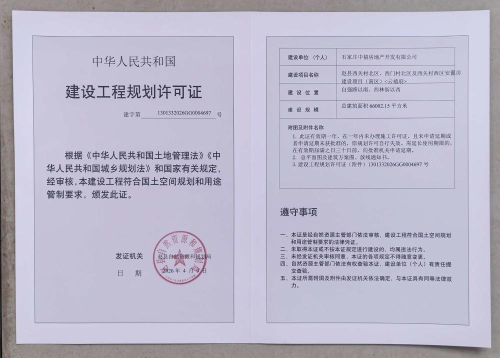 石家庄中禧房地产开发有限公司赵县西关村北区、西门村北区及西关村西区安置房建设项目(南区)<云禧府>建设工程规划许可证