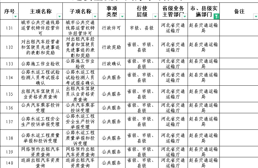 “放管服”改革,方便企业和群众办事创业,推动企业群众办事“一网通办”,按照“成熟一批,公布一批”的原则,县交通运输局编制了《赵县交通运输局全流程网办事项清单》,现予以公布,接受社会监督。