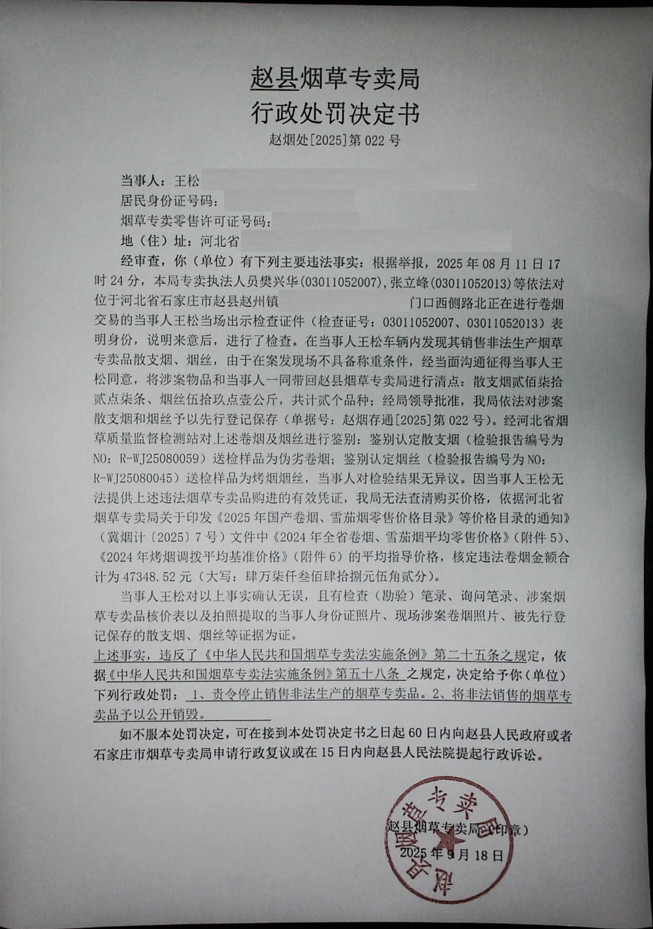 赵烟处[2025]第022号行政处罚决定书公示
