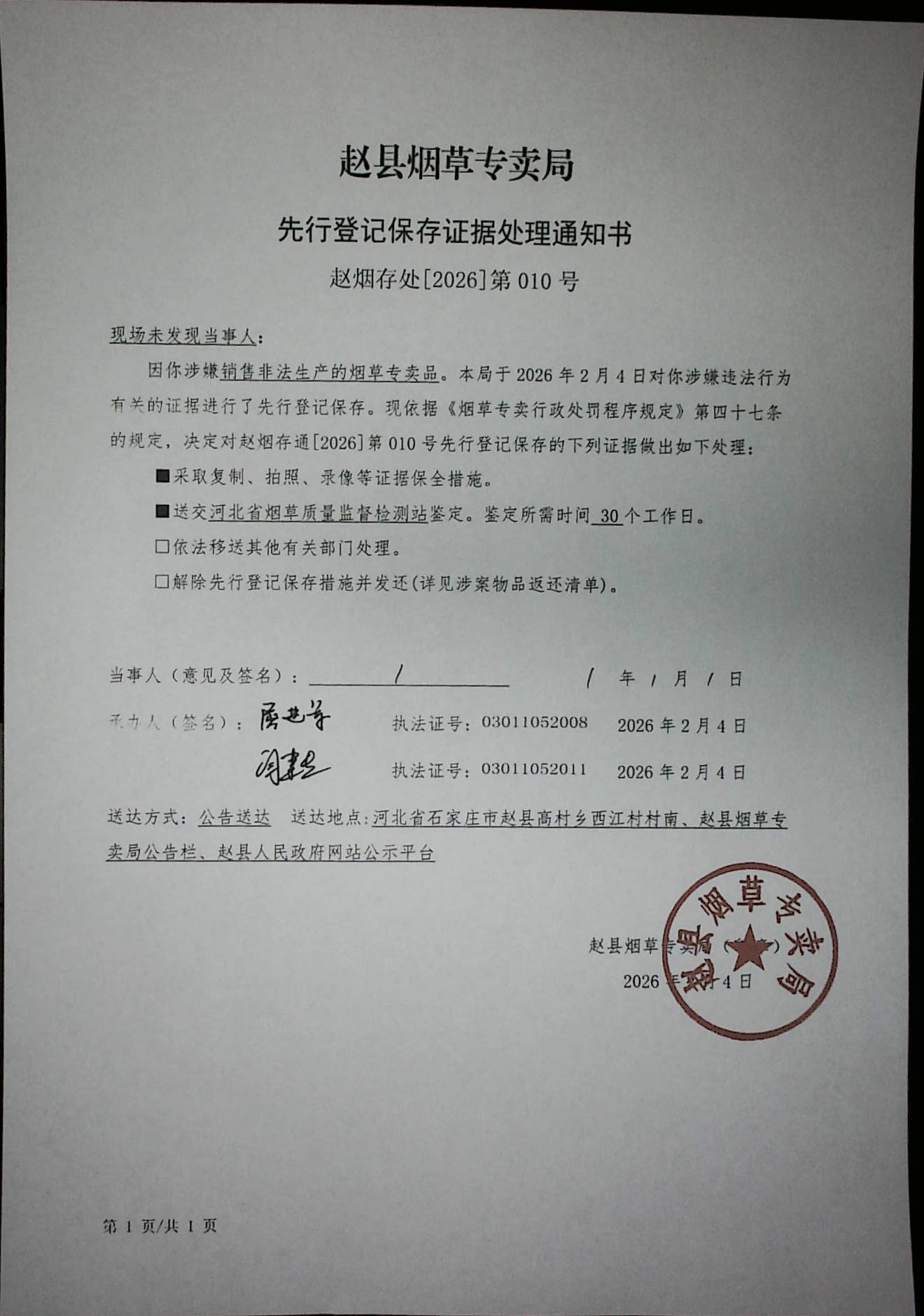 赵烟存处[2026]第010号