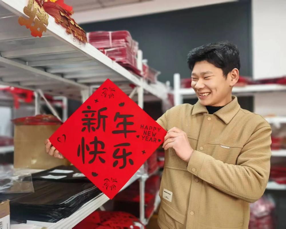 据了解,春节前,前大章乡的电商直播迎来销售高峰,产业园内,单个直播间抖音平台日均销售量2000余单。与此同时,四德村个体工商户也忙得热火朝天。对联、福字成了爆款,订单量翻倍增长,销售额节节攀升。直播间里“年味”十足,主播们带着大家挑选春节装饰,后台订单不断刷新,打印纸一卷接一卷,打包好的快递堆成小山,村民们加班加点却干劲十足:“忙是忙,但看着订单多、收入涨,心里高兴!”