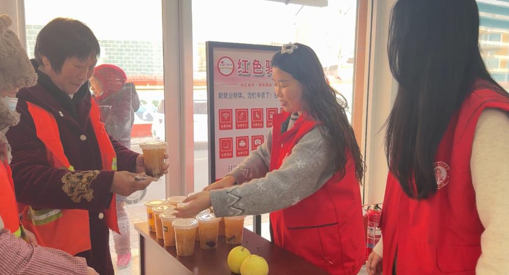 活动现场,社区准备了分装好的温热梨汤。社区工作人员将一份份心意送到户外工作者手中,详细了解他们的工作情况和实际需求,并仔细叮嘱他们注意防寒保暖。