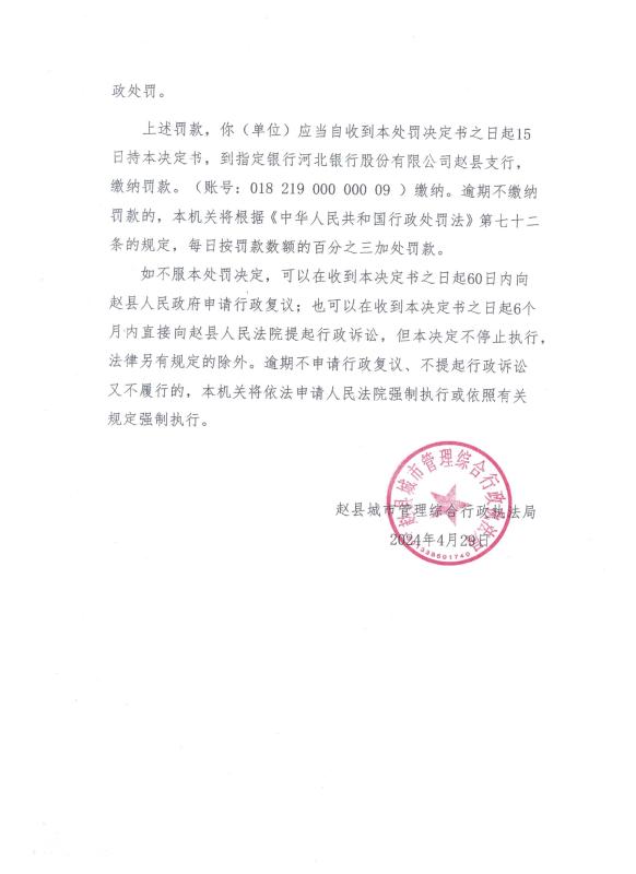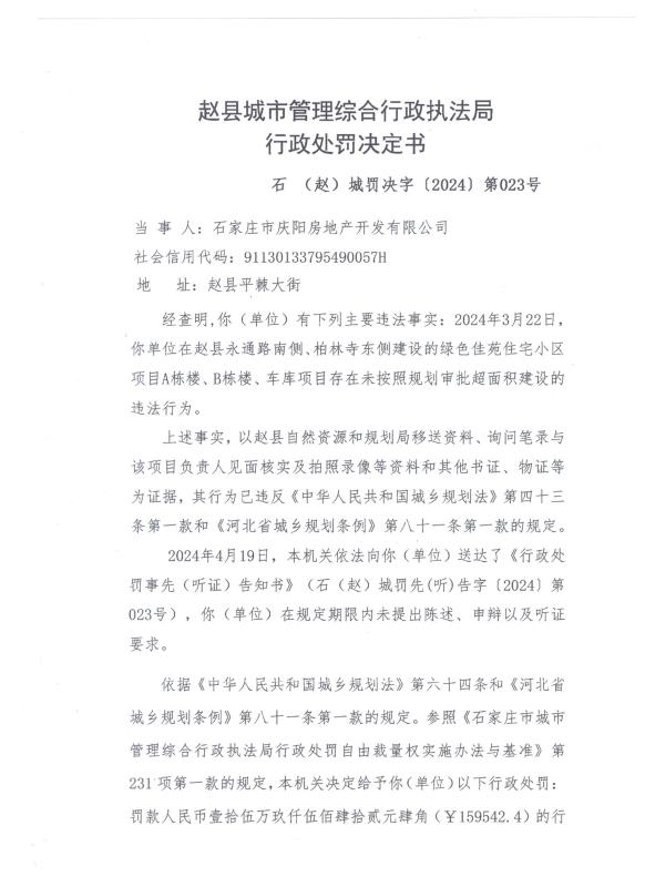 石家庄庆阳房地产开发有限公司在赵县永通路南侧、柏林寺东侧建设的绿色佳苑住宅小区项目A栋楼、B栋楼、车库项目存在未按照规划审批超面积建设的违法行为处罚决定
