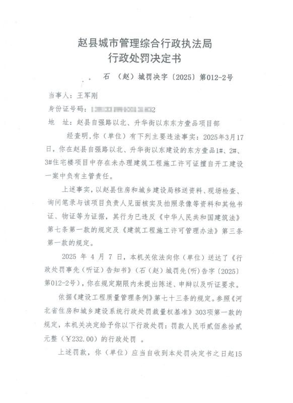 王军刚在赵县自强路以北、升华街以东建设的东方壹品1#、2#、3#住宅楼项目中存在未办理建筑工程施工许可证,擅自开工建设一案中负有主管责任的违法行为