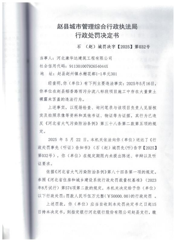 河北康华达建筑工程有限公司在赵县稻香路雨污分流八标段项目施工中存在大量黄土裸露未苫盖的违法行为处罚决定