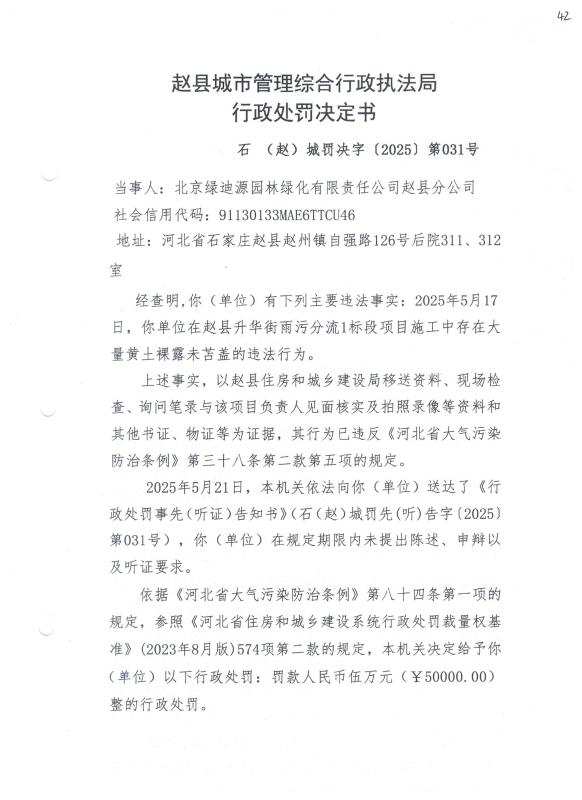 北京绿迪园林绿化有限责任公司赵县分公司在赵县升华街雨污分流1标段项目施工中存在大量黄土裸露未苫盖的违法行为处罚决定