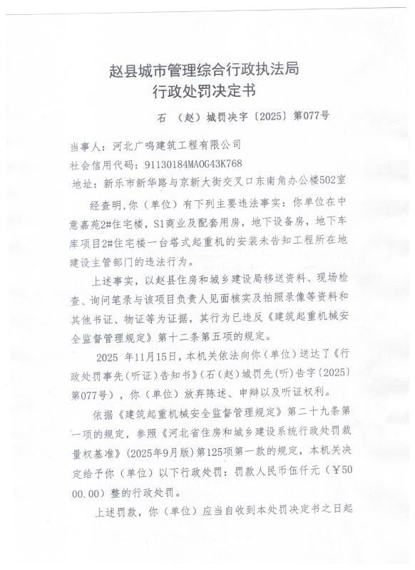 河北广鸣建筑工程有限公司在中意嘉苑2#住宅楼,S1商业及配套用房,地下设备房,地下车库项目2#住宅楼一台塔式起重机的安装未告知工程所在地建设主管部门违法行为处罚决定