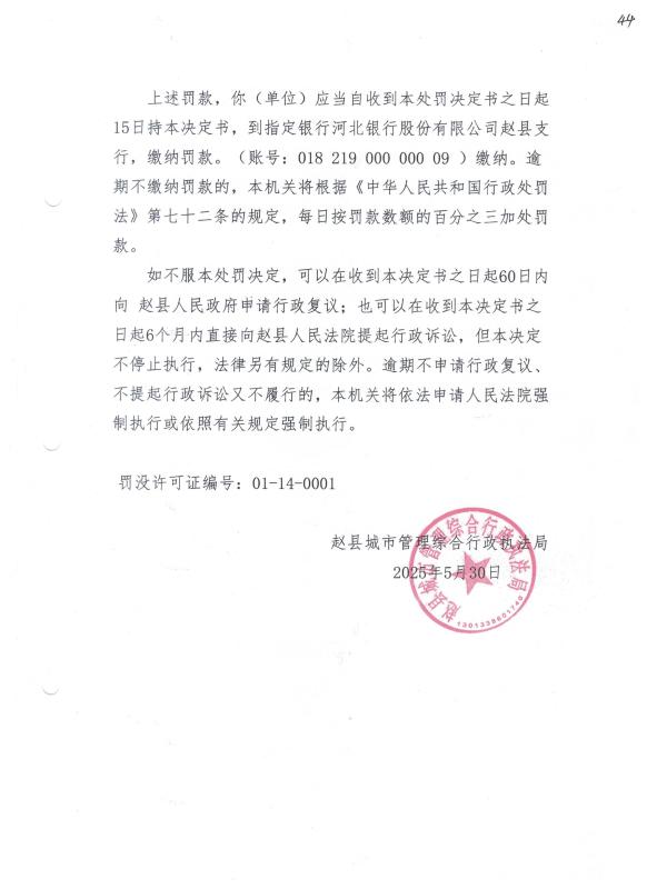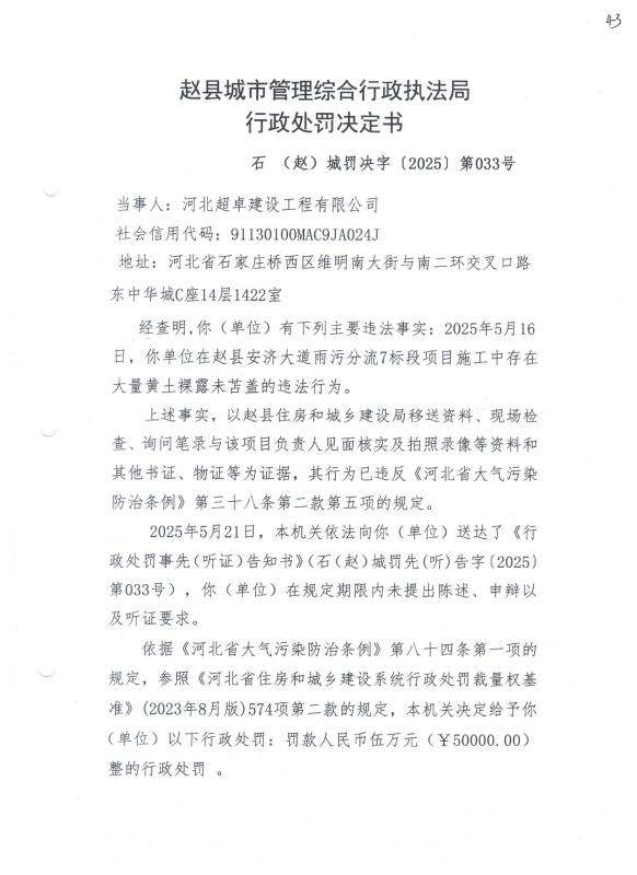 河北超卓建设工程有限公司在赵县安济大道雨污分流7标段项目施工中存在大量黄土裸露未苫盖的违法行为处罚决定