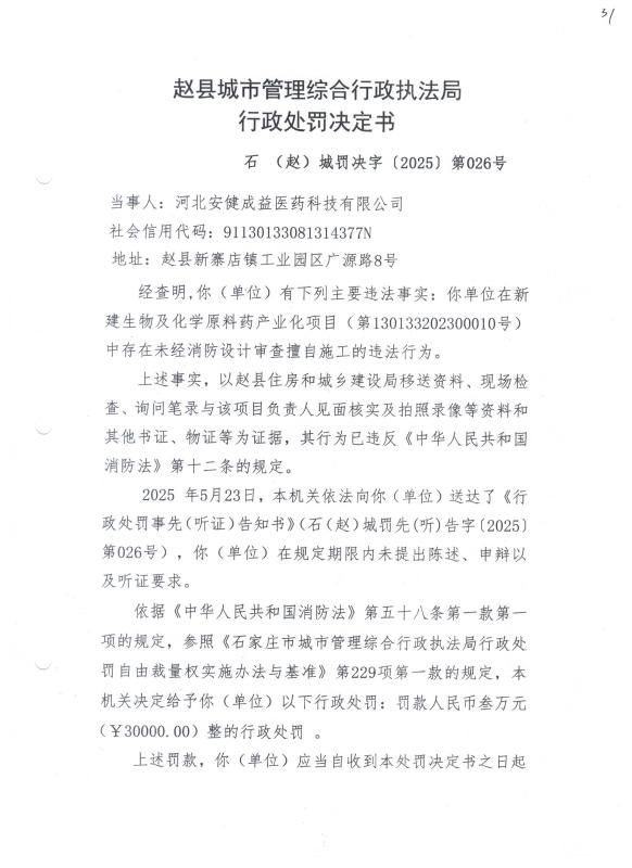 河北安健成益医药科技有限公司在新建生物及化学原料产业化项目中存在未经消防设计审查擅自施工的违法行为处罚决定