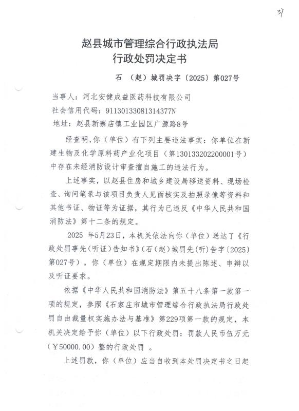 河北安健成益医药科技有限公司在新建生物及化学原料药产业化项目中存在未经消防设计审查擅自施工的违法行为