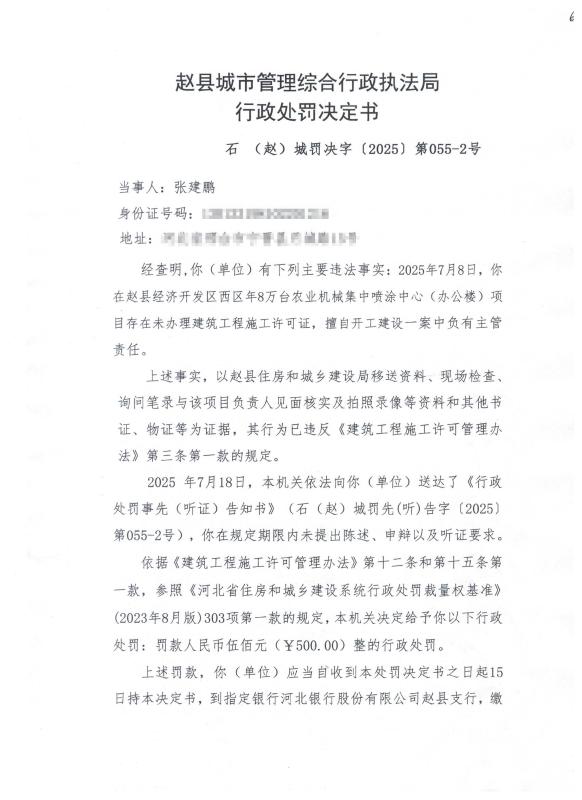张建鹏在赵县经济开发区西区年8万台农业机械集中喷涂中心(办公楼)项目存在未办理建筑工程施工许可证,擅自开工建设一案中负有主管责任的违法行为处罚决定