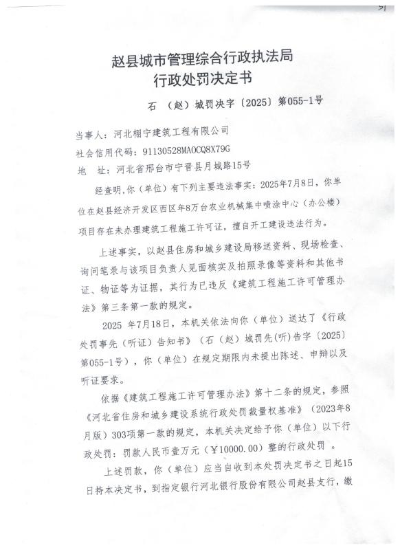 河北栩宁建筑工程有限公司在赵县经济开发区西区年8万台农业机械集中喷涂中心(办公楼)项目存在未办理建筑工程施工许可证,擅自开工建设的违法行为处罚决定
