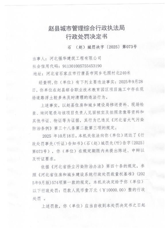 河北强华建筑工程有限公司在赵县综合职业技术教育园区项目施工中存在现场道路浮土较多未及时清理的违法行为处罚决定
