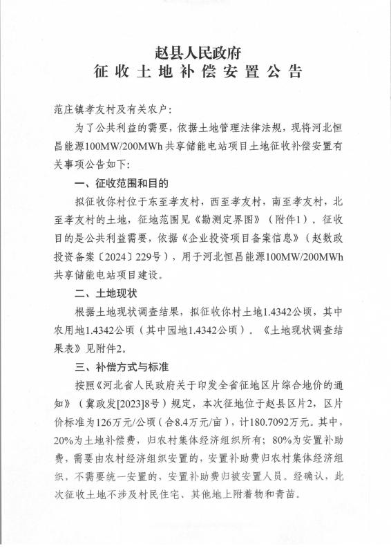 河北恒昌能源100MW/200MWh共享储能电站项目征收土地补偿安置公告