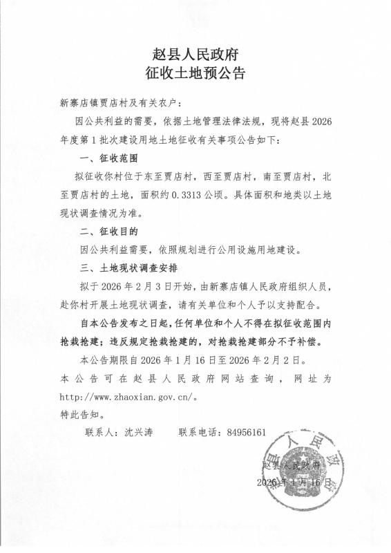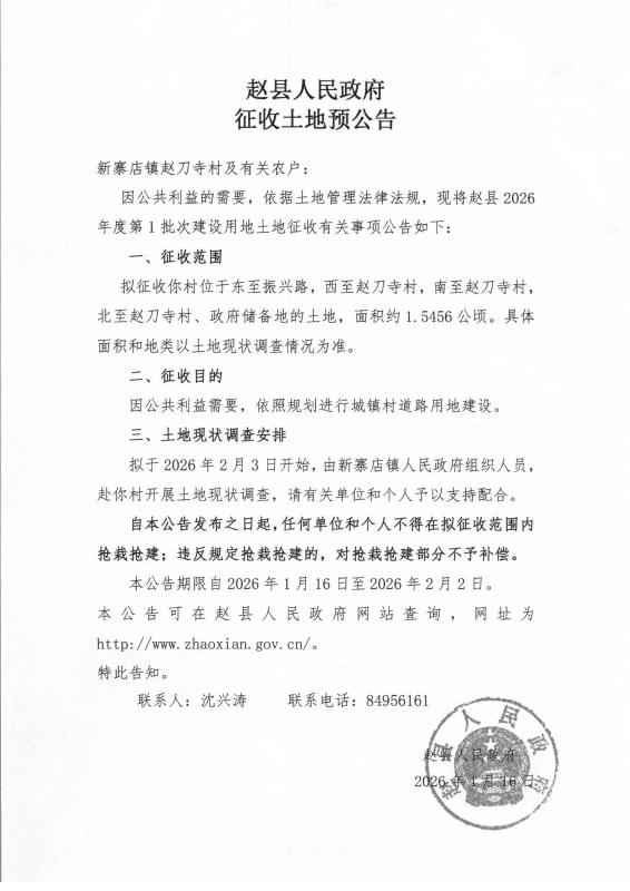 赵县2026年度第1批次建设用地征收土地预公告