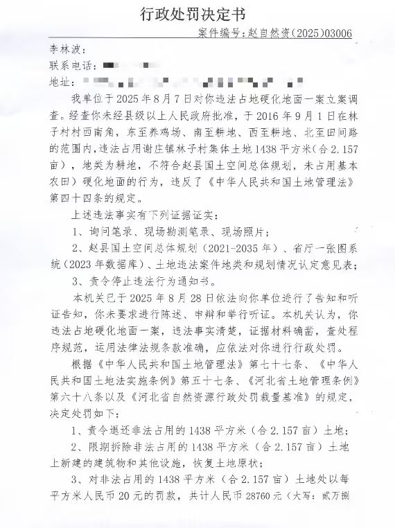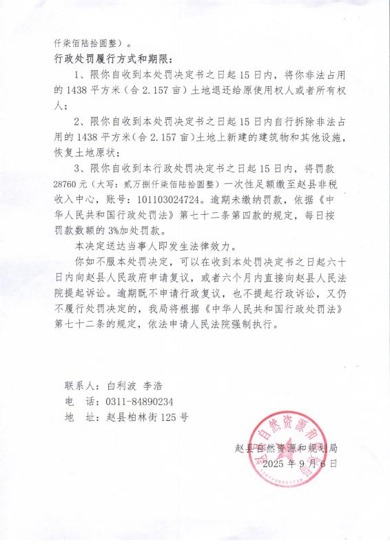 赵县自然资源和规划局关于赵自然资〔2025〕03006号《行政处罚决定书》的公示