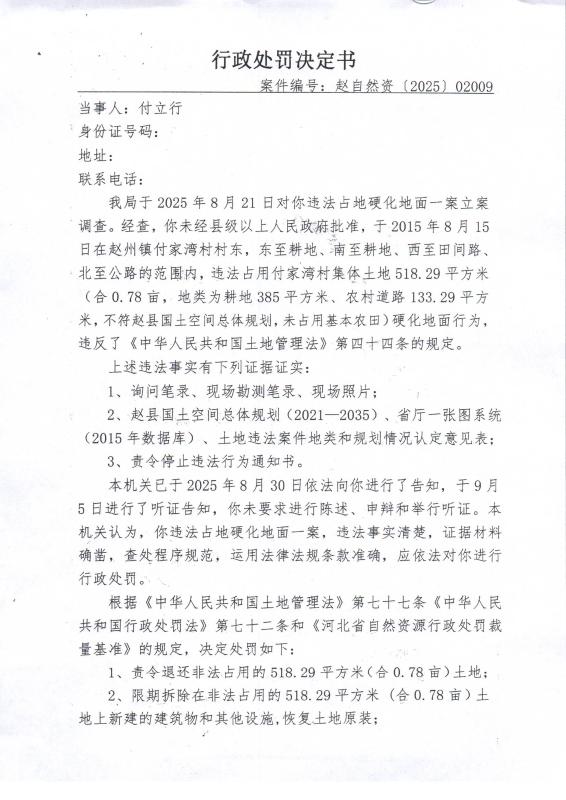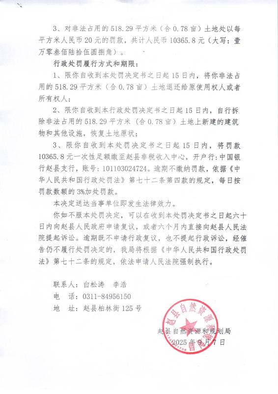 赵县自然资源和规划局关于赵自然资〔2025〕02009号《行政处罚决定书》的公示
