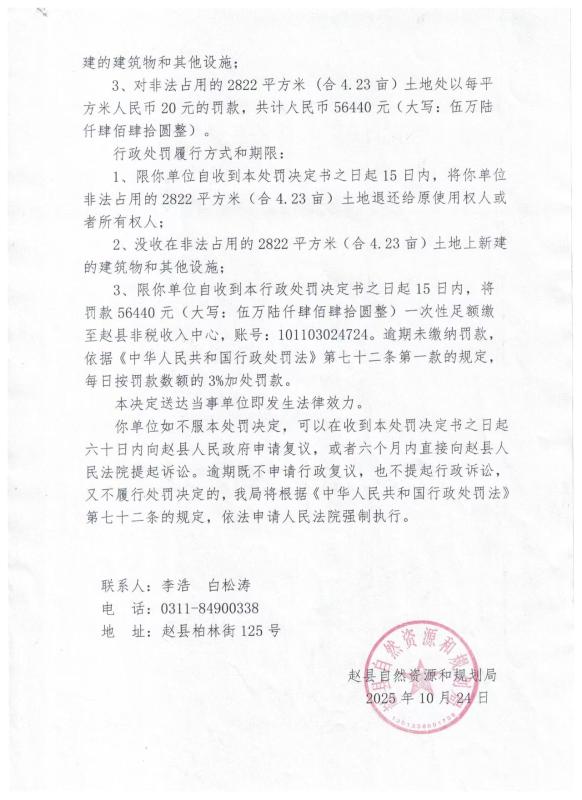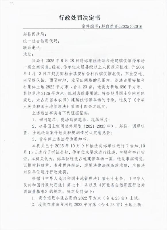 赵县自然资源和规划局关于赵自然资〔2025〕02016号《行政处罚决定书》的公示
