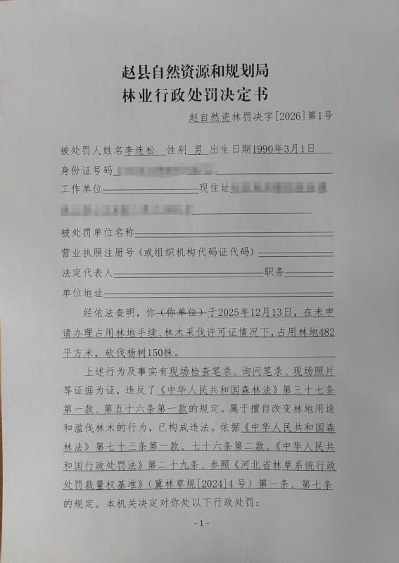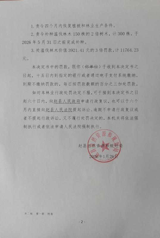 赵县自然资源和规划局林业行政处罚决定书 赵自然资林罚决字〔2026〕第1号