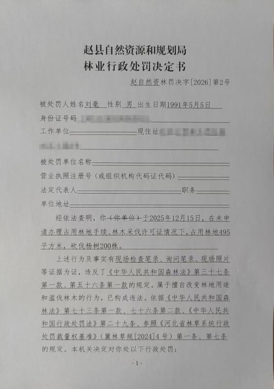 赵县自然资源和规划局林业行政处罚决定书 赵自然资林罚决字〔2026〕第2号