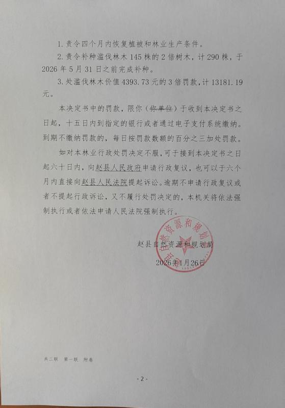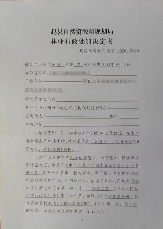 赵县自然资源和规划局林业行政处罚决定书 赵自然资林罚决字〔2026〕第6号