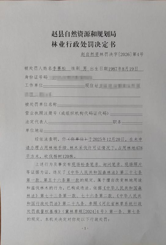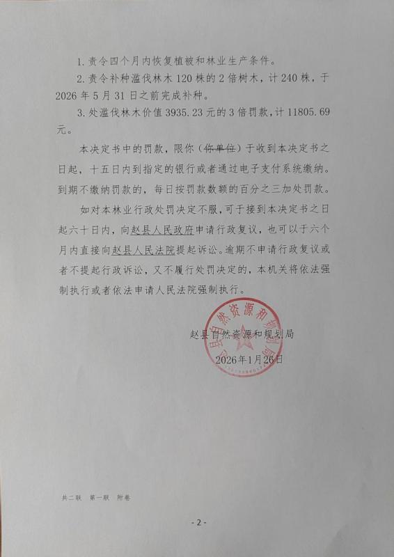 赵县自然资源和规划局林业行政处罚决定书 赵自然资林罚决字〔2026〕第4号