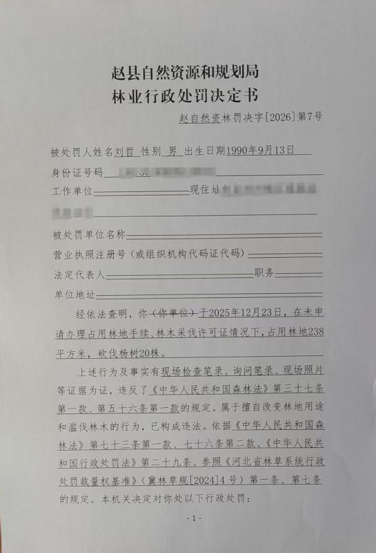 赵县自然资源和规划局林业行政处罚决定书 赵自然资林罚决字〔2026〕第7号